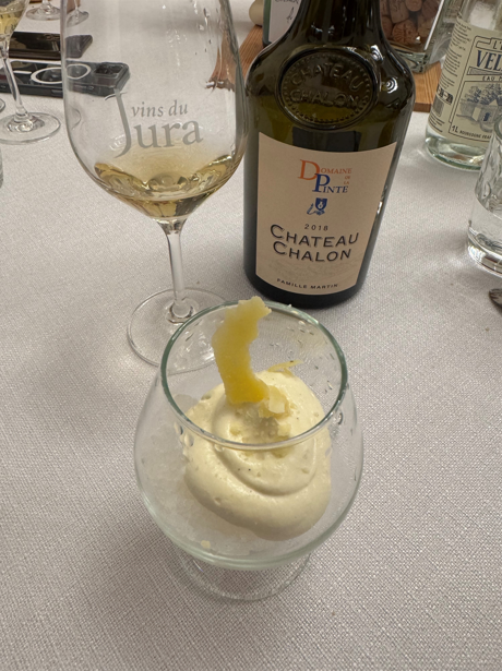 Le Chef Gaël vous propose en accord met et vin : émulsion de comté et sa tuile de comté .