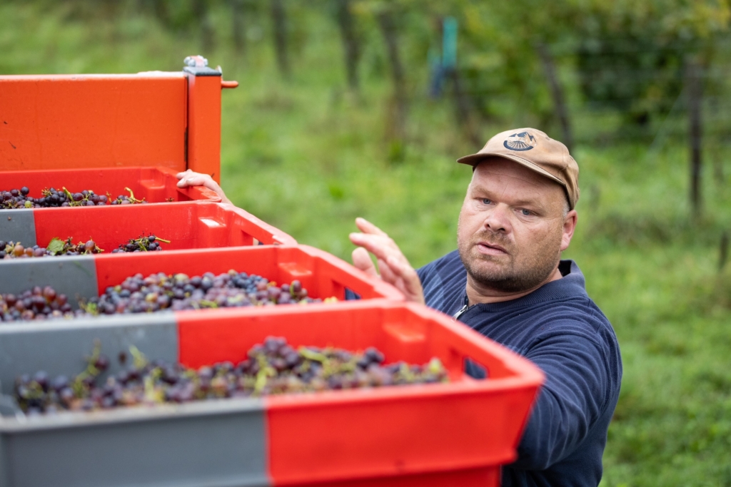 Malgré un ciel gris et un temps maussade, l’atmosphère des vendanges reste chaleureuse et pleine d’énergie!